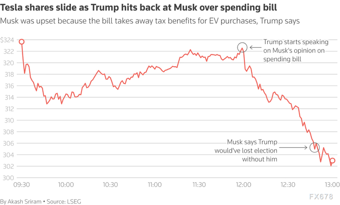 这场口水战不仅停留在口头交锋,还对资本市场产生了巨大冲击。特斯拉作为马斯克的旗舰企业,首当其冲受到波及。周四,特斯拉股价收盘暴跌14.3%,市值一日之内蒸发约1500亿美元。投资者对马斯克与特朗普关系恶化的担忧,以及政府可能取消与特斯拉相关补贴和合同的传言,成为股价暴跌的直接原因。
