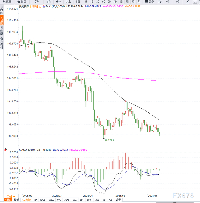 从技术面观察,美元指数在日线图上持续运行于100日指数移动均线(EMA)下方,整体空头趋势维持。14日相对强弱指标(RSI)报38.80,显示下行动能依然占优。短线下方关注98.00附近支撑,该区间既是布林带下轨,也是重要心理防线。