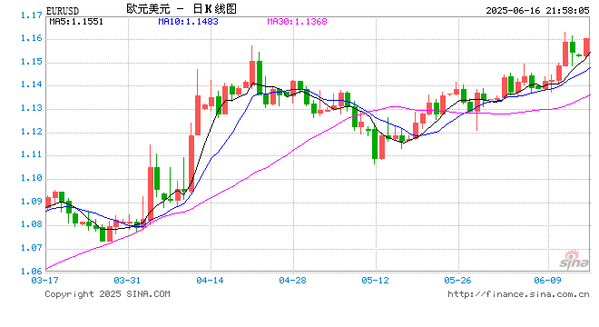 新浪外汇消息2025年06月16日,截至21时57分,外汇市场上欧元兑美元汇率突破1欧元兑换1.1603美元。涨幅为0.5093%