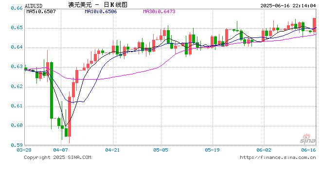 新浪外汇消息2025年06月16日,截至22时13分,外汇市场上澳元兑美元汇率突破1澳元兑换0.6551美元。涨幅为1.0083%