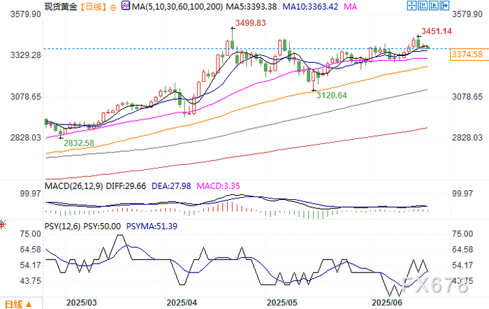 现货黄金日线图 来源:易汇通北京时间6月18日10:24 现货黄金 报 3374.58 美元/盎司