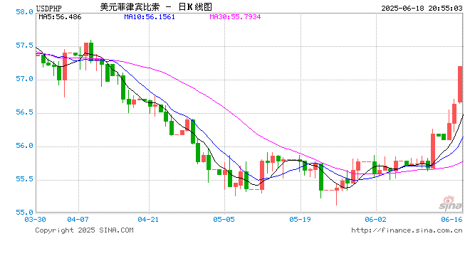 新浪外汇消息2025年06月18日,截至20时54分,外汇市场上美元兑菲律宾比索汇率突破1美元兑换57.1990菲律宾比索。涨幅为1.0083%