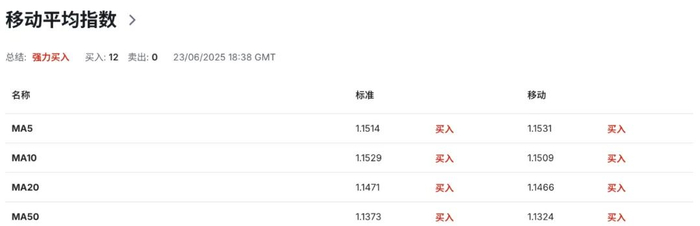 然而,据路透社报道,美国总统特朗普表示,此次针对伊朗三个关键核设施的打击是“决定性且有限”的,但在强调不会进一步扩大军事行动后,又暗示可能考虑“更换伊朗政权”,令市场一时无所适从。与此同时,伊朗已启动关闭霍尔木兹海峡议案,并对以色列发射导弹,原油价格因此飙升至五个月高点。分析认为,这一系列动作仍在市场风险接受范围之内,并未引发市场极端恐慌情绪,交易员风险偏好有所缓和,美元指数在触及50日均线99.50附近区域后形成回落,欧元受到风险偏好支撑,并形成进一步反弹刷新高点至1.1581价位水平。