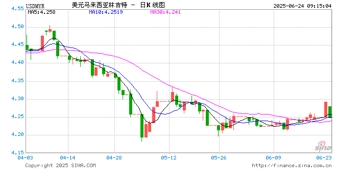 新浪外汇消息2025年06月24日,截至09时14分,外汇市场上美元兑马来西亚林吉特汇率跌破1美元兑换4.2480马来西亚林吉特。跌幅为-1.0252%