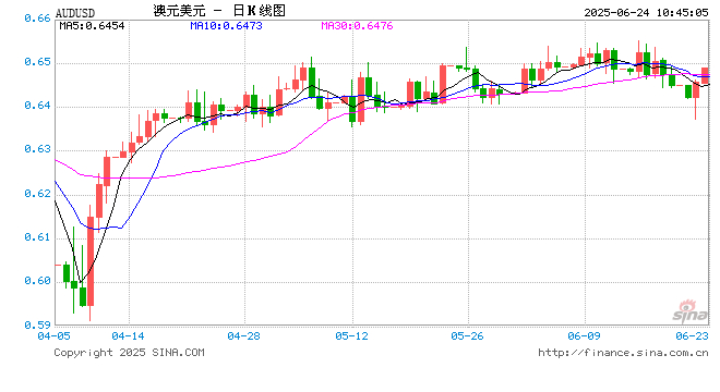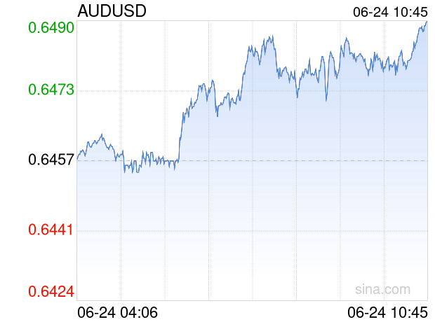 新浪外汇消息2025年06月24日,截至10时45分,外汇市场上澳元兑美元汇率突破1澳元兑换0.6490美元。涨幅为0.5111%