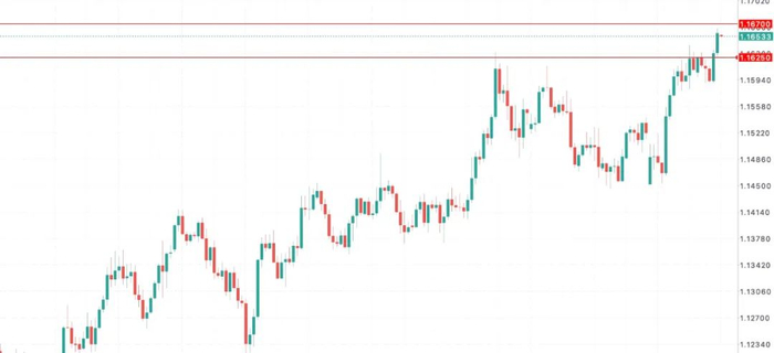 周三美国市期间,欧元自触继续刷新2021年10月,以及2025年度高点至1.1665价位水平。日内低点触及1.1589价位水平。
