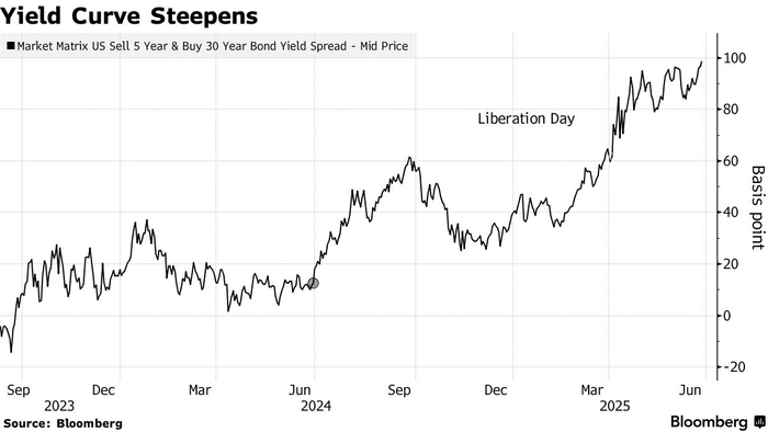 从收益率曲线来看,目前30年期与5年期美债收益率之差已经逼近了100个基点,触及了2021年以来最高的水平。