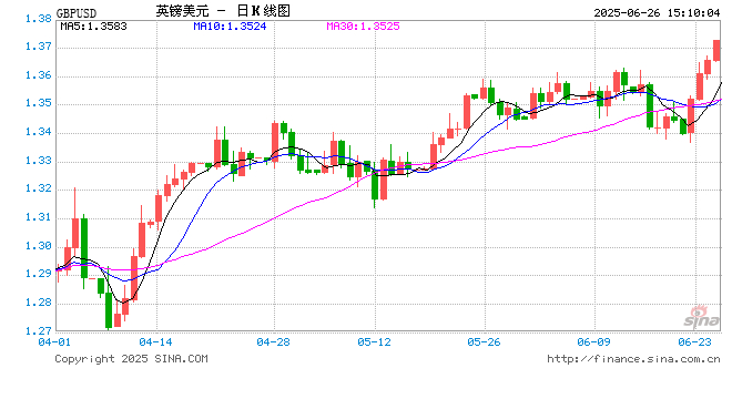 新浪外汇消息2025年06月26日,截至15时09分,外汇市场上英镑兑美元汇率突破1英镑兑换1.3729美元。涨幅为0.5279%