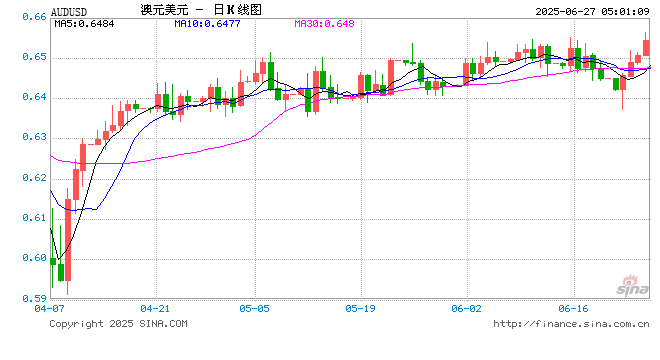 新浪外汇消息2025年06月27日,截至05时00分,外汇市场上澳元兑美元汇率突破1澳元兑换0.6543美元。涨幅为0.5748%