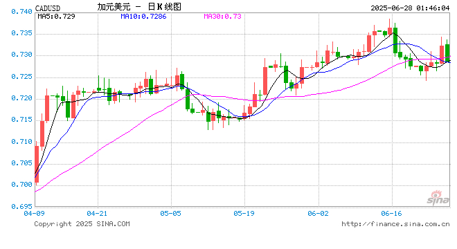 新浪外汇消息2025年06月28日,截至01时45分,外汇市场上加元兑美元汇率跌破1加元兑换0.7286美元。跌幅为-0.5053%