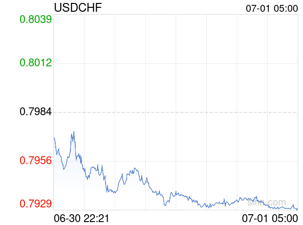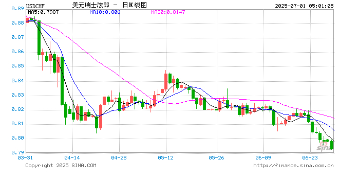 新浪外汇消息2025年07月01日,截至05时00分,外汇市场上美元兑瑞士法郎汇率跌破1美元兑换0.7930瑞士法郎。跌幅为-0.6714%