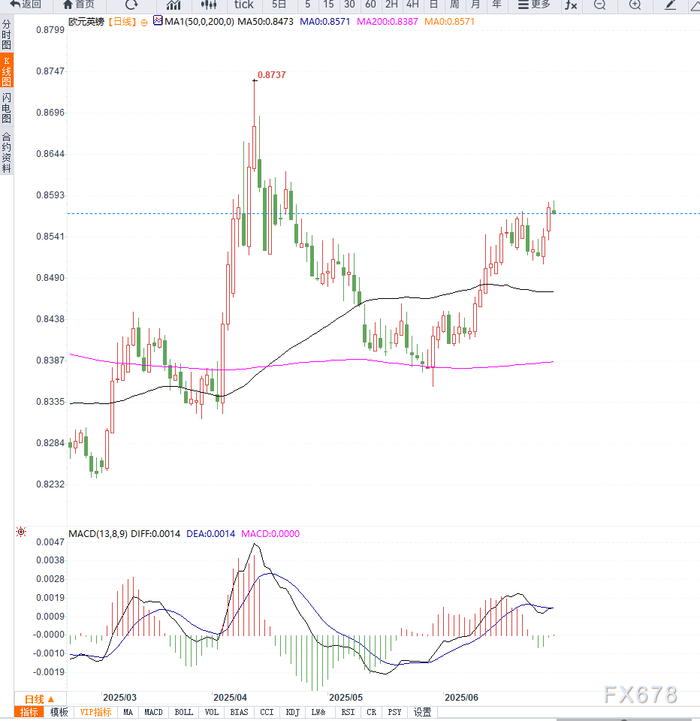 当前EUR/GBP在0.8575附近震荡,若跌破0.8565-0.8570支撑区域,可能进一步下探至6月低点0.8535附近。反之,若德国疲软数据未扩展至欧元区整体,且BoE偏鸽预期增强,则汇价或有望反弹测试0.8600-0.8620阻力带。