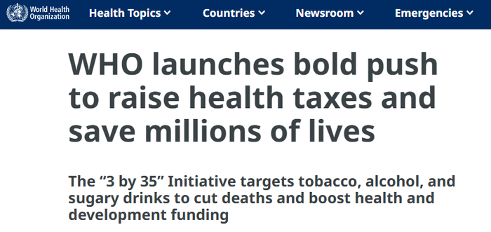 财联社7月3日讯(实习编辑 达玥/编辑 潇湘)当地时间本周三(7月2日),世卫组织发起了一项名为“3by35”的倡议(到2035年落实3项健康税),呼吁各国通过征收健康税,到2035年将烟草、酒精和含糖饮料的实际价格提高至少50%,遏制慢性病的同时,还能创造重要的公共收入。