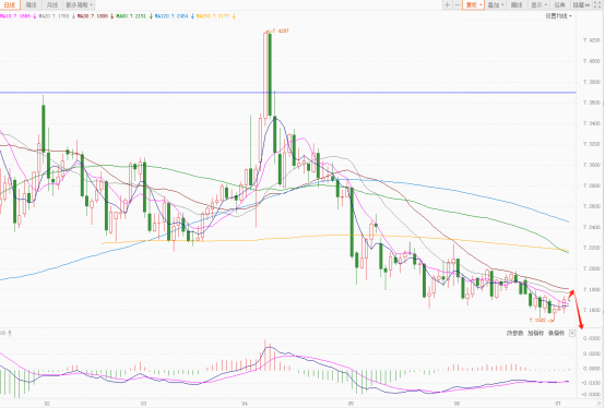 美元对人民币的离岸价经过多次震荡运行,从前期低点6.9651开始再次震荡上涨,目前突破并运行在在MA250均线上方;价格并在4月8日创出7.4287的新高后,出现明显承压回落走势,日内短线行情则建议看空震荡回落的走势。