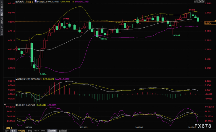 纽元的疲软表现反映了市场对新西兰经济前景的谨慎态度,尤其是全球贸易环境的不确定性对依赖出口的新西兰经济构成了潜在威胁。此外,新西兰储备银行(RBNZ)将于周三召开政策会议,市场普遍预期其官方隔夜拆款利率(OCR)将维持在3.25%不变,利率掉期交易显示这一概率高达81%。在全球风险情绪低迷的背景下,纽元的短期走势可能继续受到压制。