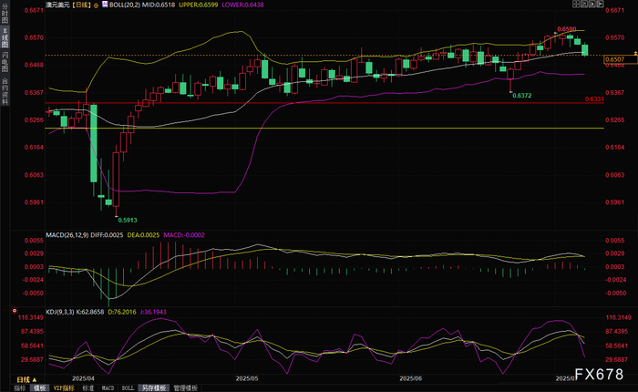 周一(7月7日)亚洲时段,澳元兑美元一度下跌0.73%至0.6500,创下6月25日以来的最低水平。上周,澳元仅小幅上涨0.3%,在0.6590美元的八个月高位遭遇了强大的阻力。这一阻力位的存在,表明市场对澳元的看涨动能有所保留。