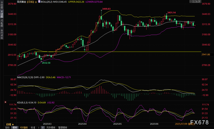 周三(7月9日)亚市早盘,现货黄金窄幅震荡,目前交投于3302美元/盎司附近。周二,现货黄金下跌逾1%,盘中一度跌破3300美元/盎司关口,刷新逾一周低点至3287.06美元/盎司,收盘报3301.53美元/盎司。这次金价的下跌并非单一因素所致,而是受到贸易谈判乐观情绪、美元走强、美国国债收益率攀升以及特朗普关税政策带来的复杂影响的共同作用。本交易日还将出炉美联储会议纪要,投资者需要重点关注。