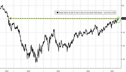 目前美国长债端的一个新压力迹象是,30年期国债收益率近四年内首次高于了20年期国债收益率。此前由于需求低迷,20年期美债一直被诟病为“最不受欢迎”的美债期限品种。
