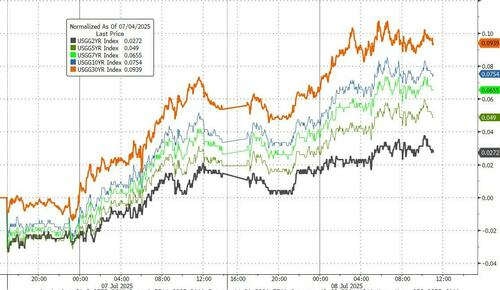财联社7月9日讯(编辑 潇湘)美国国债连续第五个交易日下跌,因全球对长期政府债券的需求疲软,美国总统特朗普宣布更多关税,再度令金融市场人心惶惶。此外,美国财政部将在今明两日标售10年期和30年期国债,不少期货和期权交易员近期一直在平掉对美国国债的一些大额看涨押注。