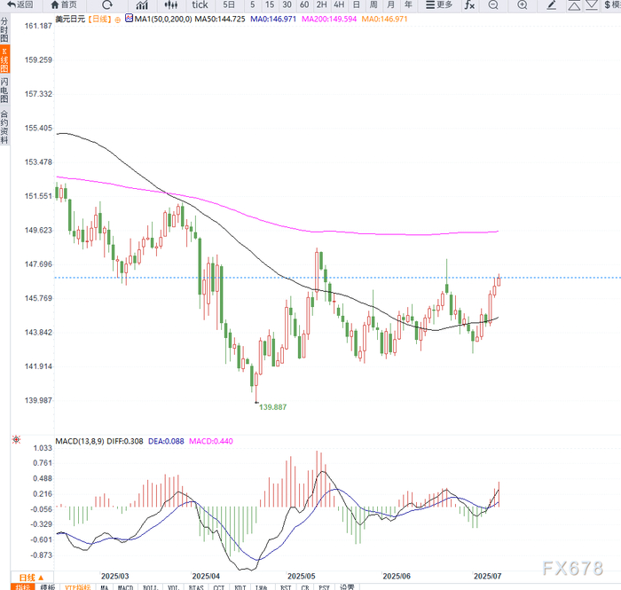 汇通财经APP讯——日元连续承压,美元强势拉动USD/JPY突破两周高点周三亚洲时段,日元继续走弱,美元兑日元突破147关口,触及两周新高。投资者对美国总统特朗普宣布自8月1日起对日本商品征收25%关税的影响深感担忧,普遍预计这将拖累日本经济表现,迫使日本央行全年不再加息。