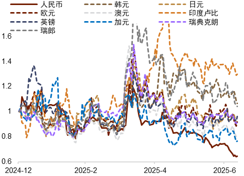 高位回落上周周初特朗普宣布对部分国家加征新关税[10]带动市场风险偏好明显走弱,而随后公布的6月FOMC会议纪要以及较强的美国经济数据基本排除了市场对7月美联储降息的预期,欧盟上周虽然未收到美国政府加征关税的来信,但在7月9日首轮关税免征期截止之前依旧没能和美国达成协议,在美元上周整体走强背景下,欧元上周收跌0.76%左右。往前看,我们认为欧元/美元的走势或继续受欧美经济的相对表现、欧美央行降息预期的变动以及美国关税政策对市场整体风险偏好的影响等多重因素的综合影响。。