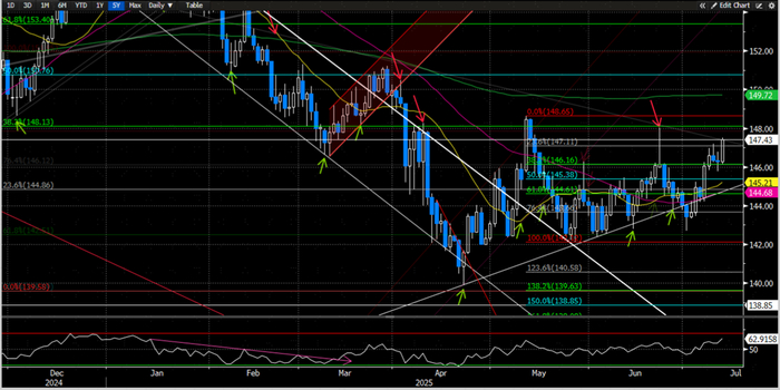 美元/日元上周初在55天均线144附近(图23中粉色线)找到支撑之后一路走高至6月中旬以来高位147.50附近;向前看,美元多头下一个目标可能位于前期高点148附近(图23中最右侧红色箭头)而近期关键的支撑则位于21天均线145附近(图23中黄色线);考虑到RSI指数依旧处于上升趋势中,我们认为本周美元/日元可能会维持高位震荡行情。