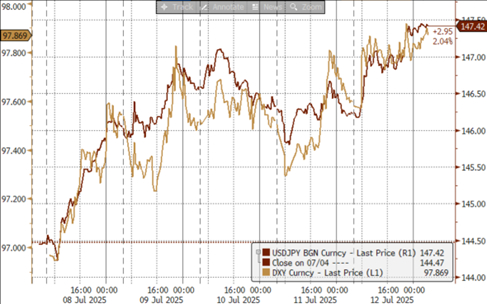 本周市场将继续关注有关贸易谈判的最新进展,目前看,在8月1日最后期限之前,特朗普或增加施压的力度。但市场目前的一致预期仍然是协议将在8月前后落地,因此我们认为关税带来的扰动或边际下降;而经济数据方面,美国6月最新的CPI通胀数据作为7月FOMC前最后一个关键数据,以及随后的零售销售数据可能将成为市场关注的焦点。目前看,美元具备一定的反弹基础,但考虑到关税不确定性仍高,市场的波动或不会提升过多。