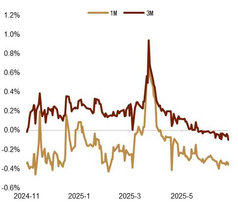 近期人民币汇率预期表现出较强韧性,汇率波动亦有降低。具体而言,尽管近期特朗普发出了新一轮的关税威胁,对市场预期的冲击偏向温和,衡量美国股债波动率的VIX和MOVE指数持续从年内高点回落(图表5),美元指数反弹的速率亦较为有限。叠加中间价稳定升值对市场预期的引导作用,当前人民币汇率波动继续降至年内低位,明显低于其余主要货币(图表6),RR等指标亦较上周变化较小,同样显示人民币汇率预期较为稳定(图表7)。