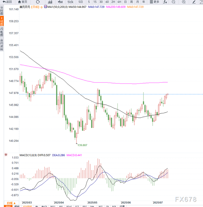 从技术走势来看,USD/JPY已有效突破100日简单移动均线(SMA),并稳居147关口上方。动量指标继续向好,未进入超买区间,表明价格上行空间尚未枯竭。