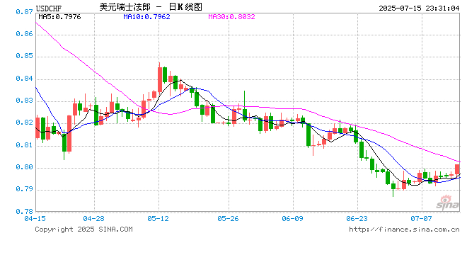 新浪外汇消息2025年07月15日,截至23时30分,外汇市场上美元兑瑞士法郎汇率突破1美元兑换0.8016瑞士法郎。涨幅为0.5015%