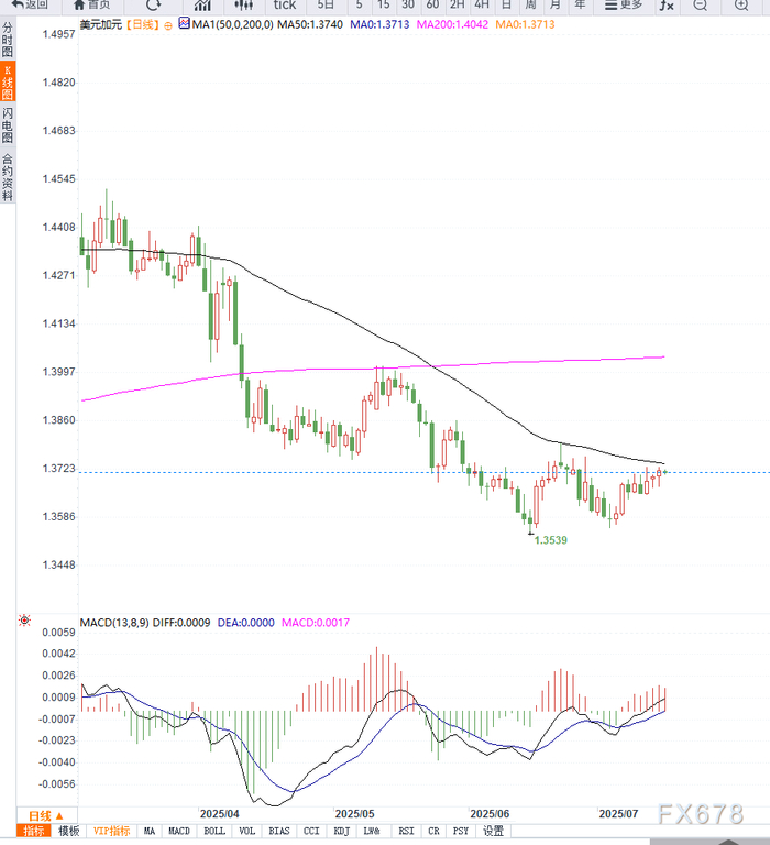 从技术角度来看,USD/CAD汇价正在测试过去一周的盘整区间上沿(1.3710),并试图有效站稳20日指数均线(约1.3682)上方,暗示短期趋势正逐步转为上行。