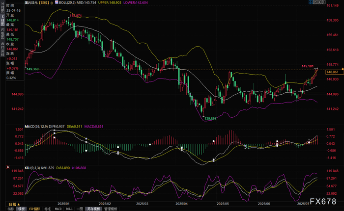 汇通财经APP讯——由于市场对日本央行加息的预期减弱,日元持续表现疲软。在美国美元强势上涨的背景下,日本国内政治不确定性进一步拖累日元。而美联储维持高利率的预期则支撑美元,助推美元/日元走强。周三(7月16日)亚洲时段,日元兑美元汇率跌至4月初以来最低水平,短期下行趋势恐将持续,美元兑日元目前交投于148.87附近,此前曾触及149.18,为4月3日以来新高。投资者普遍认为,考虑到美国加征关税对日本经济的冲击,日本央行今年将放弃加息,这成为本月以来日元持续走弱的关键因素。此外,7月20日参议院选举前的国内政治不确定性加剧了日元压力。而美元指数则稳守6月23日以来高位,因美国通胀微升强化了美联储推迟降息的预期。这些因素共同推动美元/日元在过去两周强势攀升。