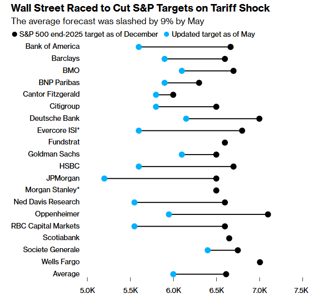 Manthey的模型现在显示,市场在反弹至纪录高位后,对潜在的贸易冲击过于乐观。Manthey指出,随着华尔街预测普遍转为看涨,这令人担忧。花旗美国策略团队在6月将标普500指数目标上调至6300点,此前因特朗普的关税冲击而曾在4月将其下调了11%。