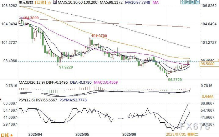 美元指数日线图 来源:易汇通北京时间7月16日14:51 美元指数 报 98.50。