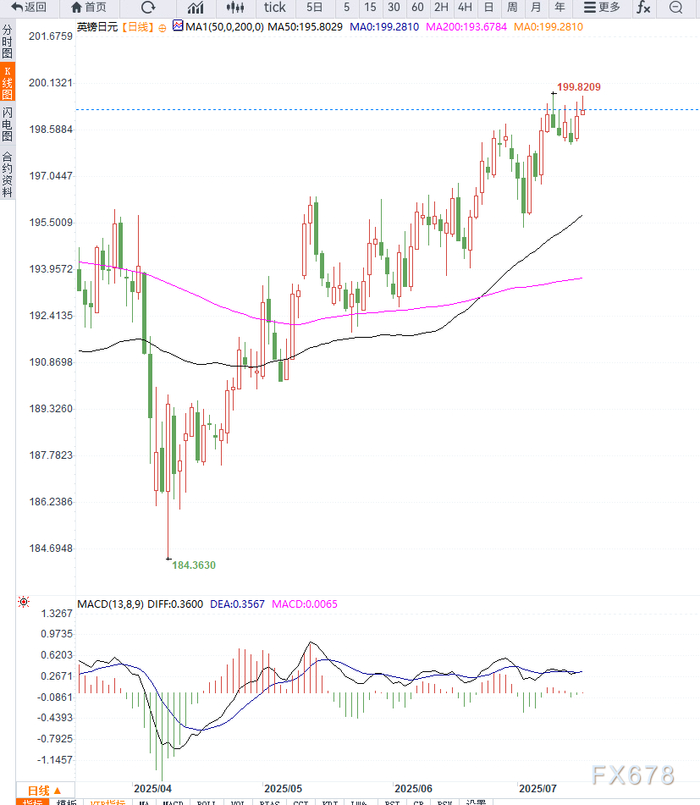 上方首个重要阻力位为200.00整数关口,同时也是布林带上轨所在区域。若有效突破该点位,将打开进一步上涨通道,目标指向200.75(5月28日高点),更上方阻力看向204.23(7月19日高点)。