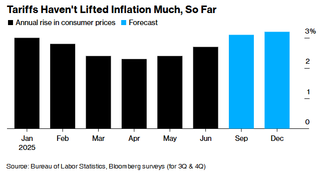 截至目前,消费价格并未出现明显的关税驱动上涨迹象。不过,在周二公布的6月数据中,有迹象显示企业开始将贸易相关成本转嫁给消费者。这进一步加剧了市场对美联储将在7月29–30日的利率会议上再次维持利率不变的预期。市场仍预期年内将有一到两次降息。