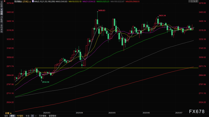 周三(7月16日)黄金市场经历了一场戏剧性波动。纽市早盘因美元走强,金价一度跌至3319.58美元/盎司的日内低点,但随后彭博一则“特朗普考虑解雇美联储主席鲍威尔”的报道瞬间点燃市场避险情绪,金价狂飙逾50美元,触及3377.17美元的三周高点。然而,剧情再度反转——特朗普迅速否认解雇计划,金价涨幅收窄至0.68%,最终收报3347.38美元。周四(7月17日)亚市早盘,现货黄金窄幅震荡,目前交投于334650美元/盎司附近。