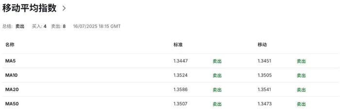 若英镑在短期内无法有效跌破1.3370区域防线,则为其多头目标反弹指向1.3580区域水平保留潜在希望。该区域水平为7月1日高点1.3790价位水平至昨日低点1.3364价位水平的黄金分割50%回撤位,与布林带中轨指向的动态阻力重合,构成技术共振,成为英镑上行走势的关键阻力水平。但在汇价未成功站稳至1.3580区域上方前,整体格局仍偏向于空头为主。
