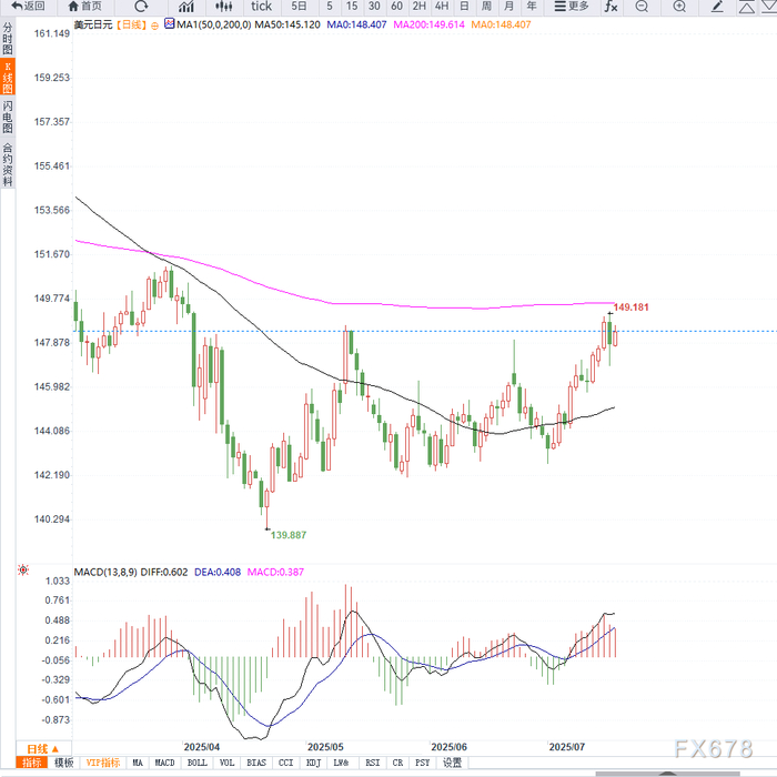 从技术角度来看,USD/JPY周三在100小时均线附近企稳后再度上扬,显示出多头信心仍在。目前指标仍位于正区域且远未过热,显示上涨空间仍存,后续有望重测149.15-149.20高点区间,若突破,或将挑战150整数关口,为3月以来首次。