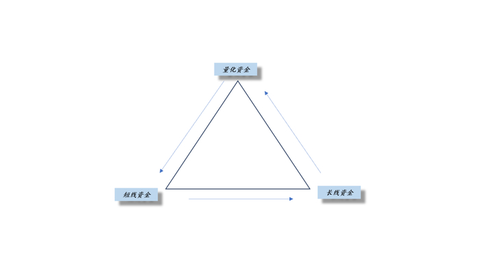 如上图所示,量化资金、短线资金和长线资金最终会形成一个稳固的三角形关系,相互牵制,相互促进,谁都无法真正彻底地消灭谁,最终,形成一个有机整体,携手并进,共同成长。