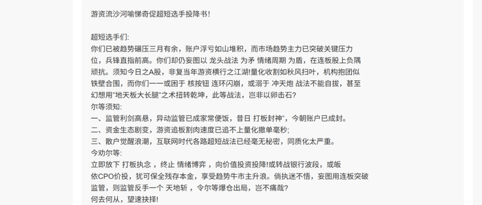 那么,谁又是那些不甘堕落的高贵的“捕猎者”呢??各种短线、超短线资金,俗称游资。他们在过去3个月过得极其悲催,被量化一遍又一遍收割,于是,有人出来发“劝降书”自嘲。