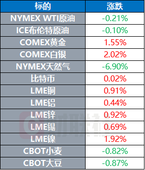 COMEX黄金期货收涨1.55%,报3410.3美元/盎司;COMEX白银期货收涨2.02%,报39.24美元/盎司。