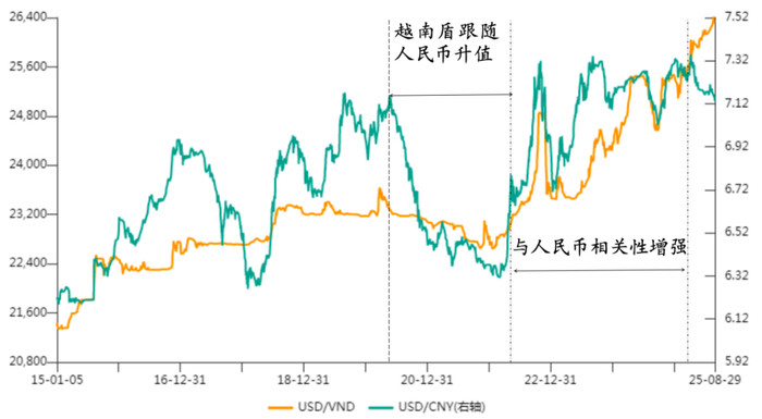这期间越南盾的走势有别于早些年“半跟随”特征下的走势——在人民币震荡或升值的时候,越南盾并没有保持对美元的稳定,而是主动对美元进行了一轮贬值。同样,也有别于后来弹性增强后“双向波动”模式下的走势——没有跟随人民币对美元升值。越南盾在2025年2月以来走出了独立走势。