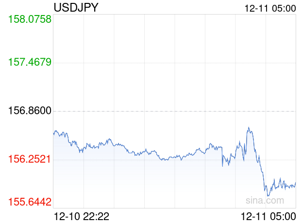 新浪外汇消息2025年12月11日,截至05时00分,外汇市场上美元兑日元汇率跌破1美元兑换155.9500日元。跌幅为-0.5801%