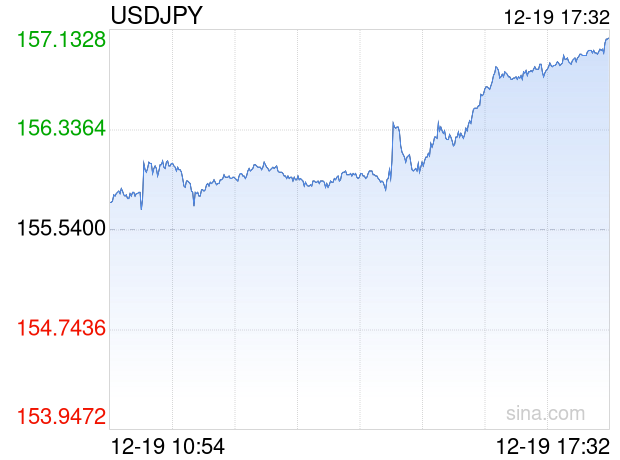 新浪外汇消息2025年12月19日,截至17时32分,外汇市场上美元兑日元汇率突破1美元兑换157.1000日元。涨幅为1.0030%