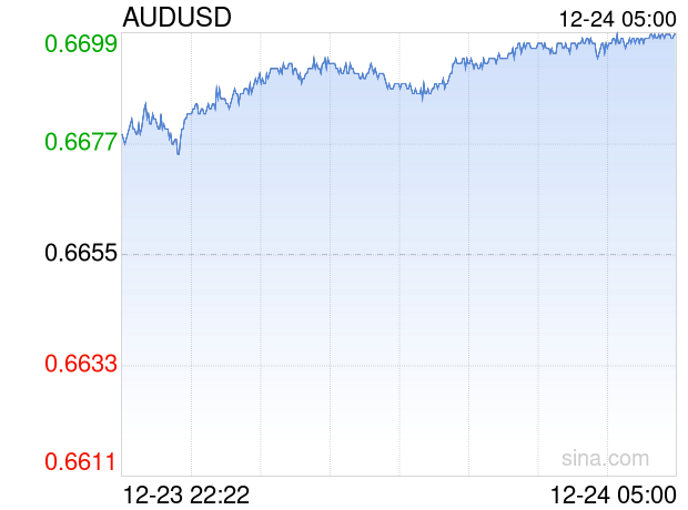 新浪外汇消息2025年12月24日,截至05时00分,外汇市场上澳元兑美元汇率突破1澳元兑换0.6699美元。涨幅为0.6612%