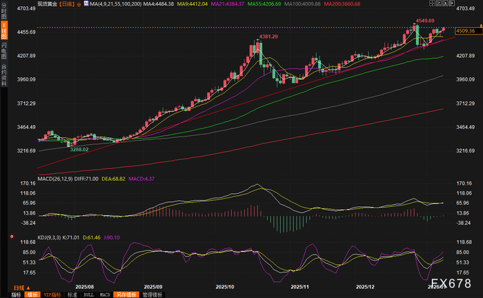 汇通财经APP讯——在2026年的第一个完整交易周,现货黄金价格再度上演惊心动魄的上涨行情,周涨幅接近4%,上周五(1月9日)收盘报4509.36美元/盎司,盘中最高一度触及4516.91美元,距离去年12月底创下的历史峰值4549.71美元已经非常接近,美国就业数据欠佳和地缘政治局势动荡,给金价提供了上涨动能。整个市场弥漫着一种难以抑制的兴奋情绪——黄金似乎正在为冲击5000美元大关积蓄最后的力量。