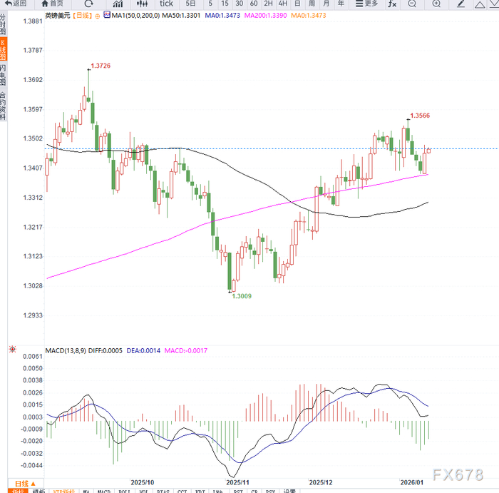 从日线图形来看,英镑兑美元在1.3390附近获得支撑后出现技术性反弹,价格重新回到短期均线附近,显示下行动能有所缓和。但整体仍处于此前回调结构中,上方1.3500—1.3550区域构成重要阻力,下方1.3400一线则是短期多空分水岭。