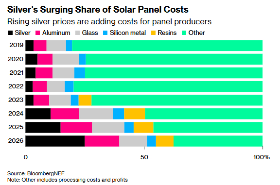 本周,现货白银价格一度飙升至每盎司93美元以上,创历史新高,在过去一年里银价已翻了逾三倍。而据一项业内研究显示,这意味着太阳能板中白银的使用成本现已占面板总成本的29%,远高于2023年的3.4%和去年的14%。