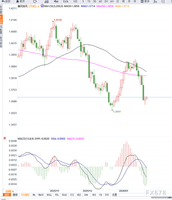 反之,若在政策事件前后美元承压,汇价跌破 1.3680,则可能引发技术性回调,下方支撑关注 1.3600–1.3620区域。若该区域失守,日线结构将逐步转向偏弱。整体来看,USD/CAD日线仍维持区间震荡特征,短期方向高度依赖央行决议及政策信号的指引。